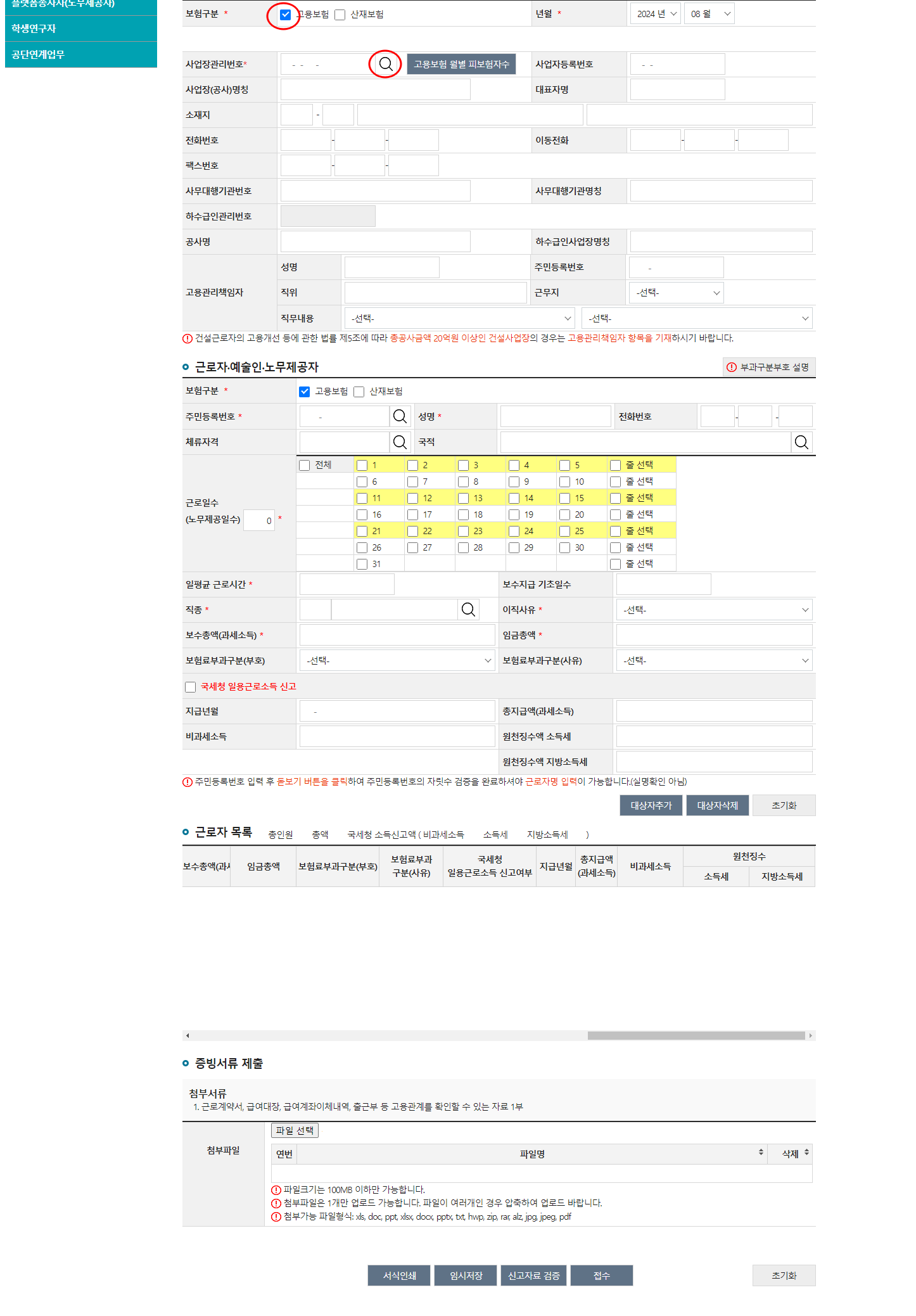 자진신고 사업장이므로 고용만 체크,