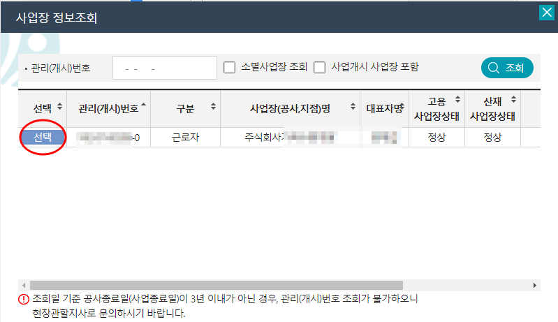 만약 고용체크 산재 둘다 체크하고 돋보기를 클릭한후 사업장 선택을 누르면,