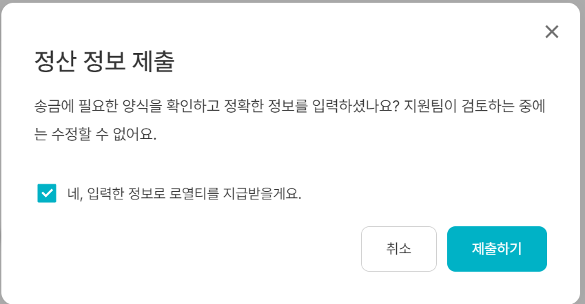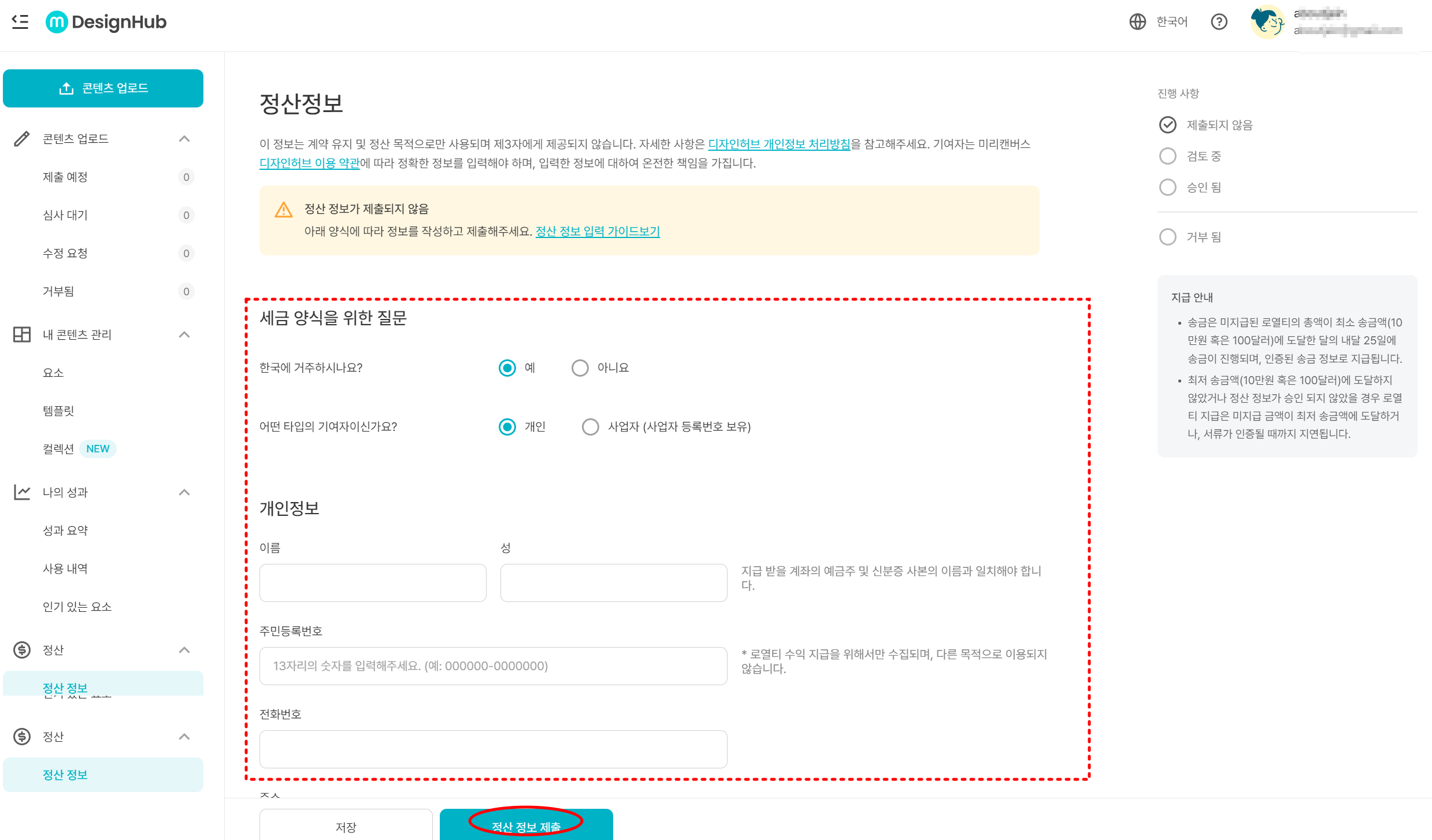 정산정보 작성시 위 캡쳐에는 나와있지 않지만