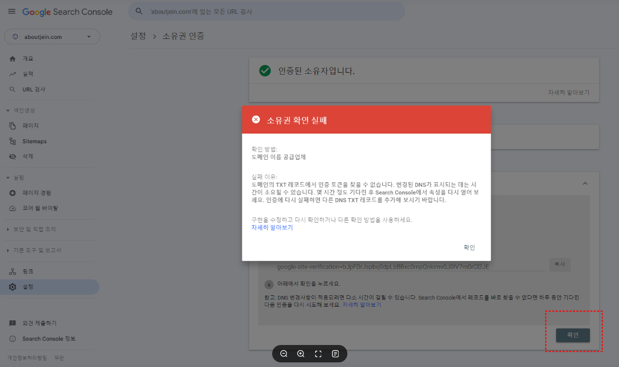 도메인의 TXT 레코드에서 인증 토큰을 찾을 수 없습니다. 변경된 DNS가 표시되는 데는 시간이 소요될 수 있습니다. 몇 시간 정도 기다린 후 Search Console에서 속성을 다시 열어 보세요. 인증에 다시 실패하면 다른 DNS TXT 레코드를 추가해 보시기 바랍니다.
