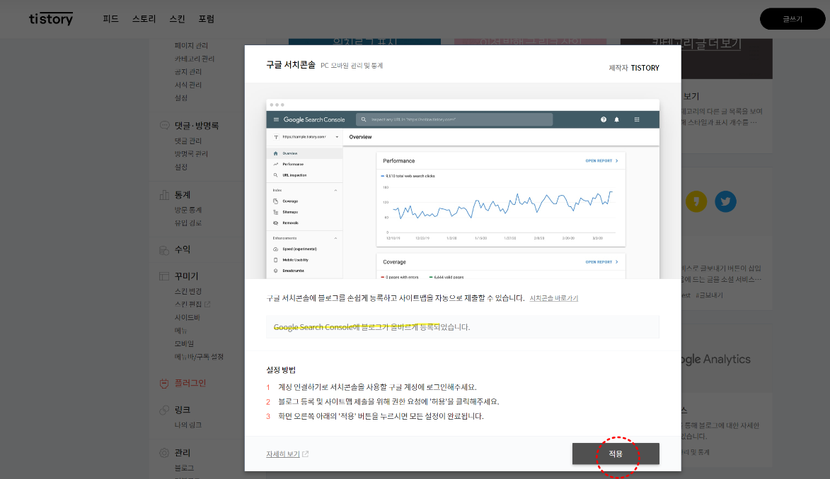 티스토리>블로그관리(계정톱니바퀴클릭)>왼쪽카테고리 하단 플러그인 > 서치콘솔 클릭