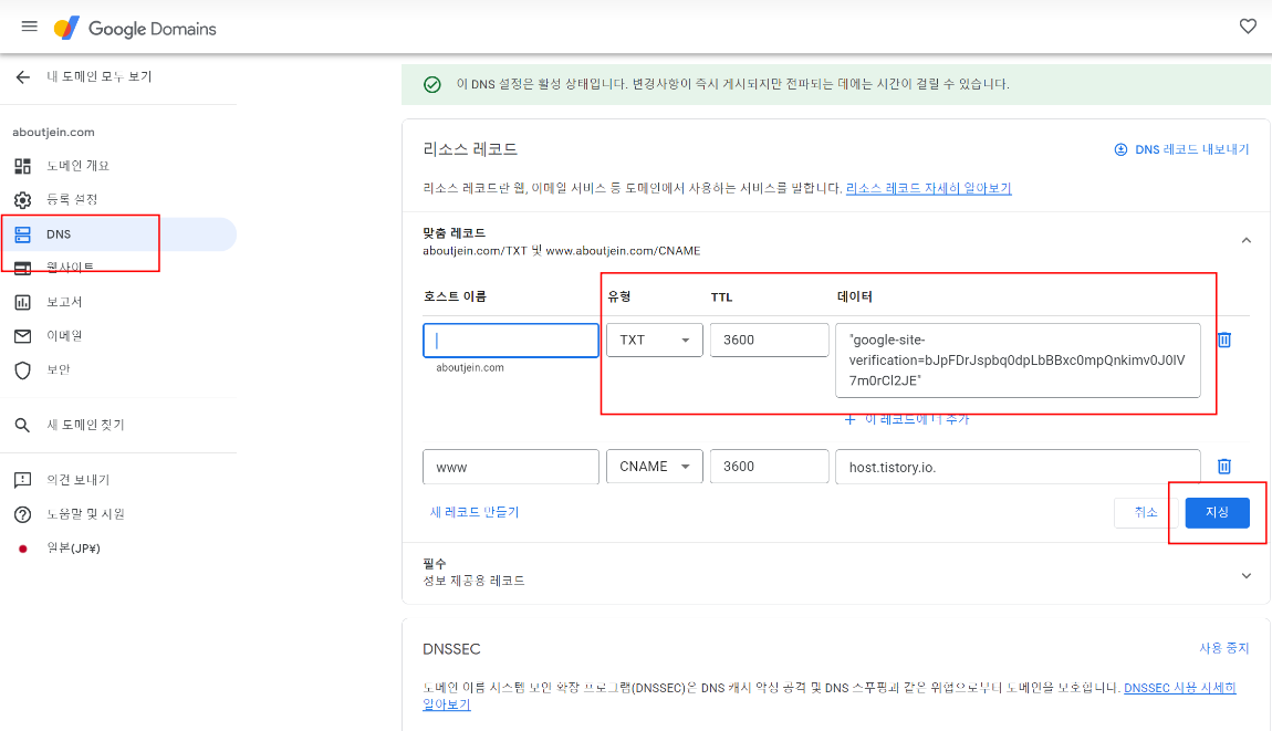 TXT 레코드 복사해서 붙여넣기 후 > 저장