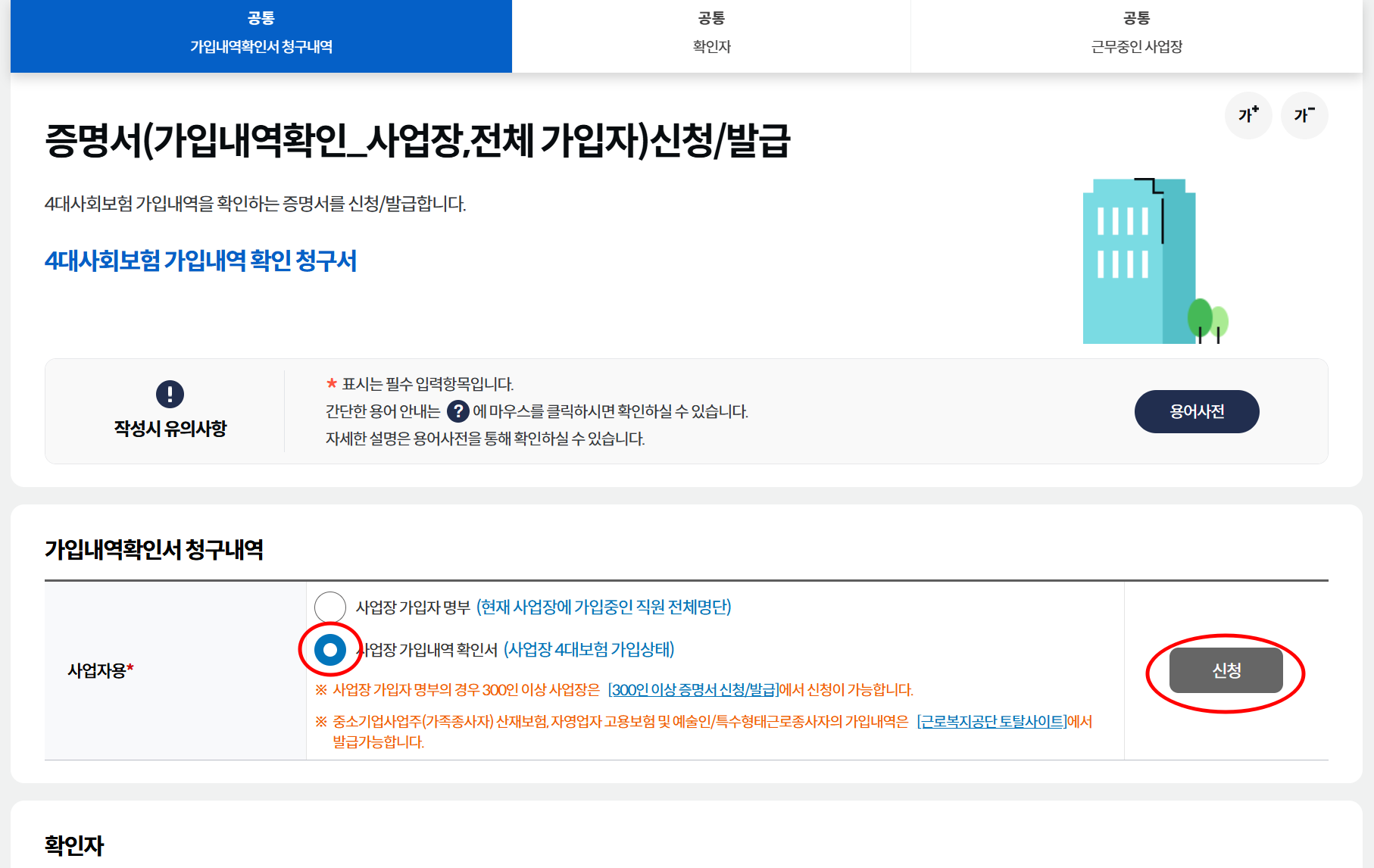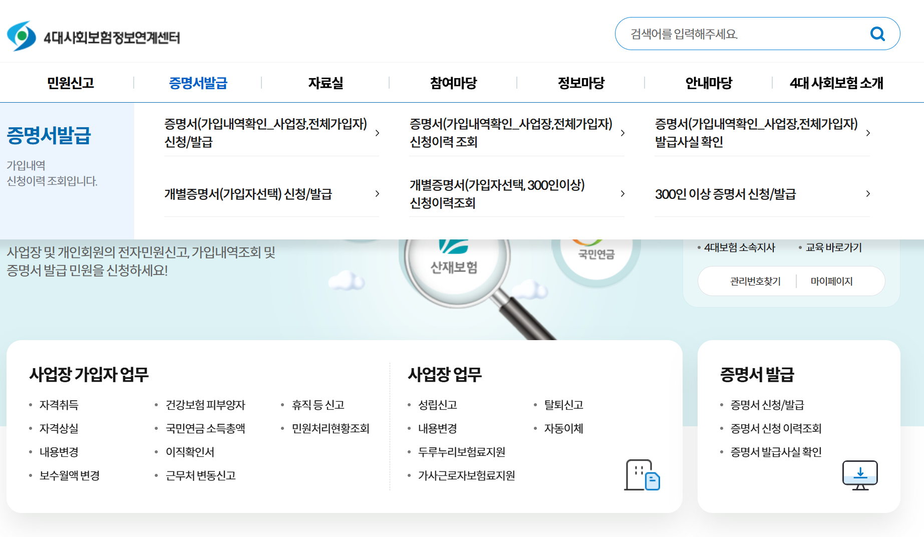 4대 사회보험 민원신고를 한번에! 사업장 및 개인회원의 전자민원신고, 가입내역조회 및 증명서 발급 민원을 신청하세요! 사업장 회원 로그인 개인 비회원 로그인