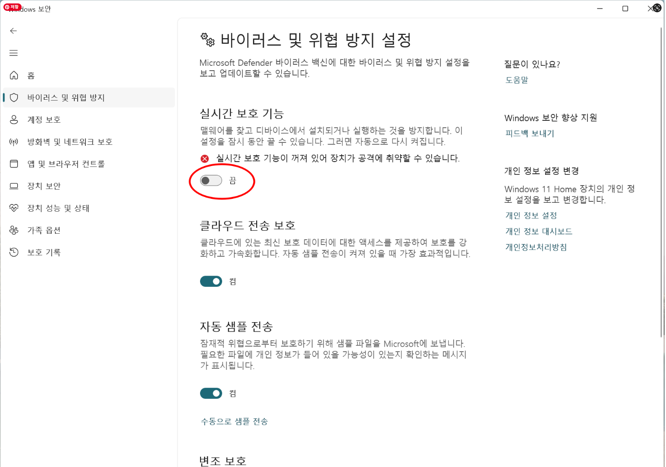 외부 백신 실시간 보호 기능이 켜지면 재가동후라도 디펜더는 켜지지 않음..